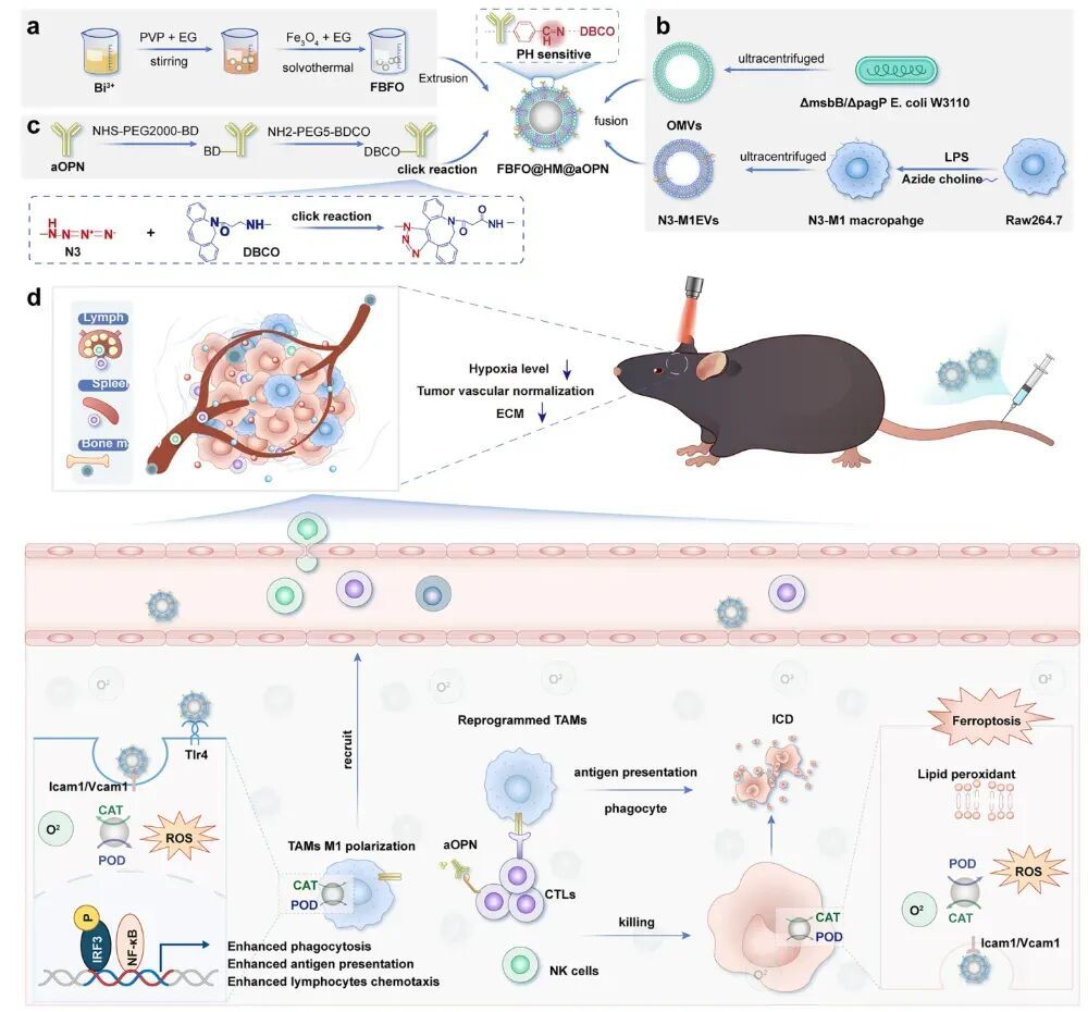 接下来,研究采用溶剂热法制备Fe₃O₄纳米颗粒(NPs),继而通过原位生长法引入Bi³⁺和聚乙烯吡咯烷酮(PVP)合成FBFO NPs。该设计通过Bi/Fe₃O₄掺杂拓宽光吸收范围并提升载流子分离效率,在660 nm激光照射下驱动光生空穴-电子对反应:与H₂O/O₂作用产生·OH和·O₂⁻(Ⅰ型PDT),同时利用Fe²⁺/Fe³⁺循环模拟过氧化物酶(POD)催化H₂O₂转化为·OH,并通过空穴氧化H₂O₂释放O₂(模拟过氧化氢酶,CAT)以缓解肿瘤缺氧微环境(TME)。为增强靶向性与生物相容性,将FBFO NPs与杂交膜(HM)复合:利用叠氮胆碱修饰Raw264.7细胞膜获得N₃标记的M1巨噬细胞外泌体(M1EVs),结合低内毒基因工程化大肠杆菌W3110来源的细菌膜囊泡(OMVs),经超声-冻融循环制备M1EV-OMV HM;通过脂质体挤出器使HM包覆FBFO形成核壳结构FBFO@HM NPs。进一步采用酸敏感连接策略偶联aOPN抗体:以苯甲醛-PEG₂₀₀₀-NHS修饰aOPN氨基端形成aOPN-PEG₂₀₀₀-BD,再与DBCO-PEG₅-NH₂缩合构建pH响应性苯甲亚胺键(在pH 6.5酸性TME中断裂),最终通过点击化学获得FBFO@HM@aOPN NPs。此系统通过HM包覆层整合M1EVs(TSG101、趋化因子受体CXCR4等)与OMVs(FtsZ)的膜组分特性,协同光催化-双酶活性实现ROS/O₂可控生成及肿瘤靶向递送(图2)。